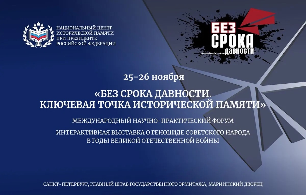 25–26 ноября 2024 г. в Санкт-Петербурге прошел Международный научно-практический форум «Без срока давности. Ключевая точка исторической памяти», организаторами которого стали Национальный центр исторической памяти при Президенте Российской Федерации, Генеральная прокуратура Российской Федерации, Федеральное архивное агентство (Росархив), Российское историческое общество, Министерство науки и высшего образования Российской Федерации, Министерство просвещения Российской Федерации и др. На форуме рассматривались итоги пятилетней деятельности по проекту «Без срока давности», собирающего и суммирующего свидетельства о преступлениях нацистов и их пособников в годы Великой Отечественной войны 1941–1945 гг.