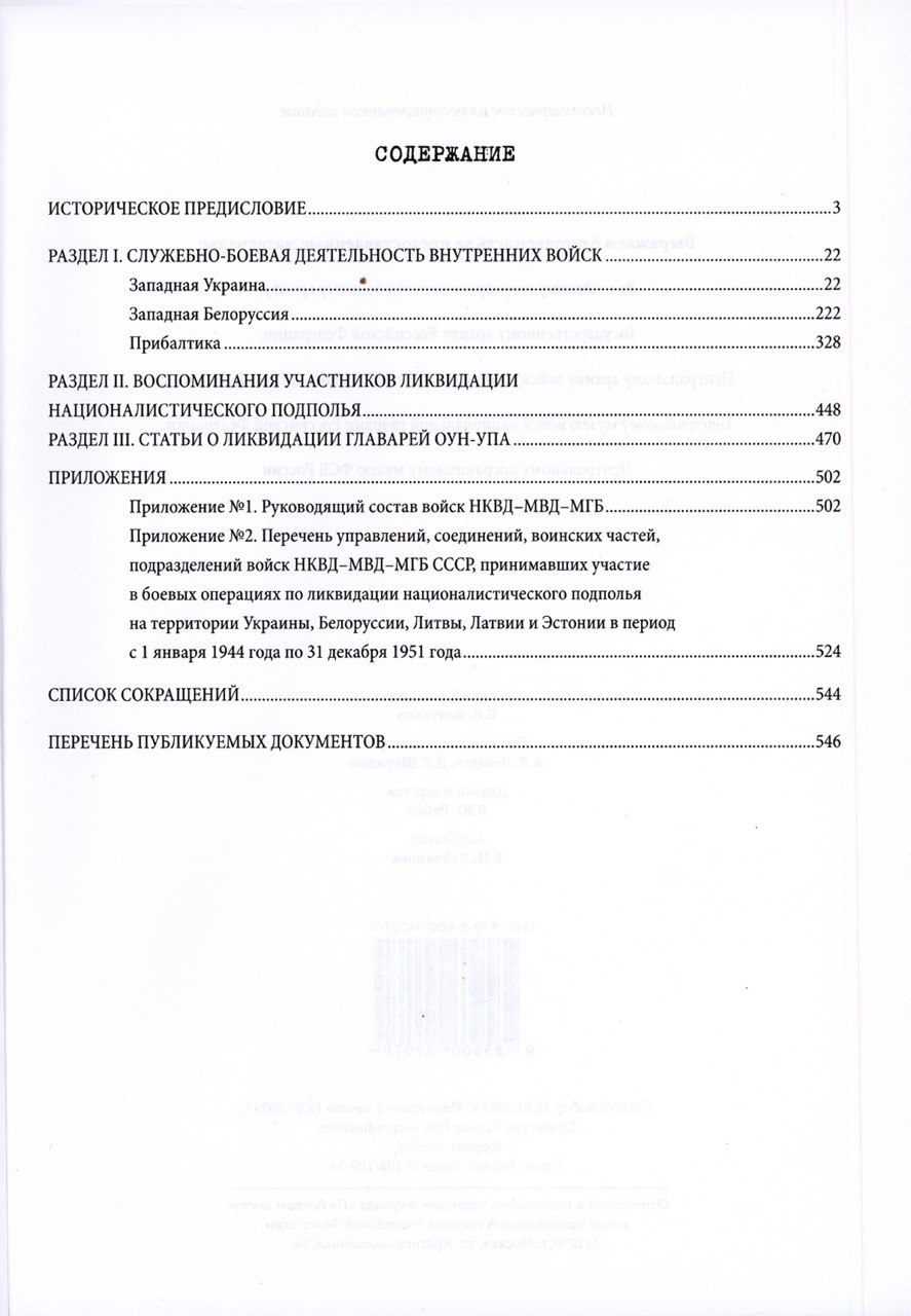 Сборник состоит из трех разделов. Первый раздел «Служебно-боевая деятельность внутренних войск» делится на три подраздела – «Западная Украина», «Западная Белоруссия» и «Прибалтика».